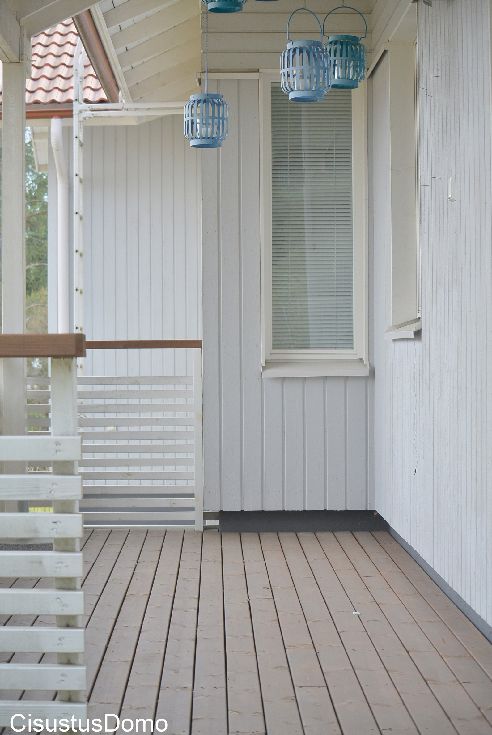 Terassi ja patio olivat alunperin ruskeat, mutta kestopuun väri oli vuosien saatossa jo haalistunut auringon ja sateen vaikutuksesta.